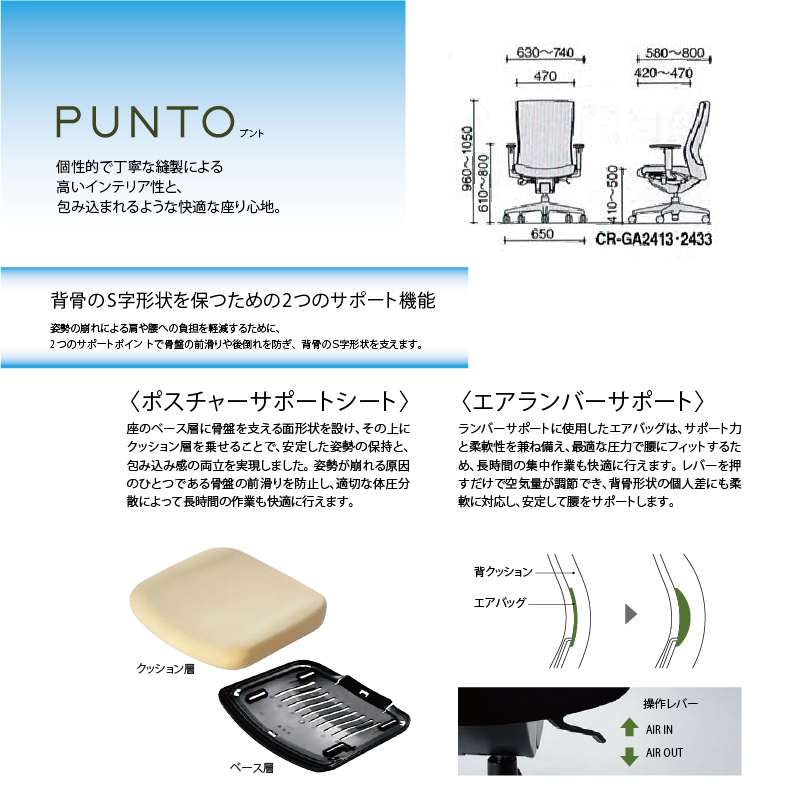 ・ガス圧上下機構 ・背座角度連動ロッキング ・ロッキング角度固定 ・座奥調整 ・ランバーサポート ・可動肘 。ハンガー |