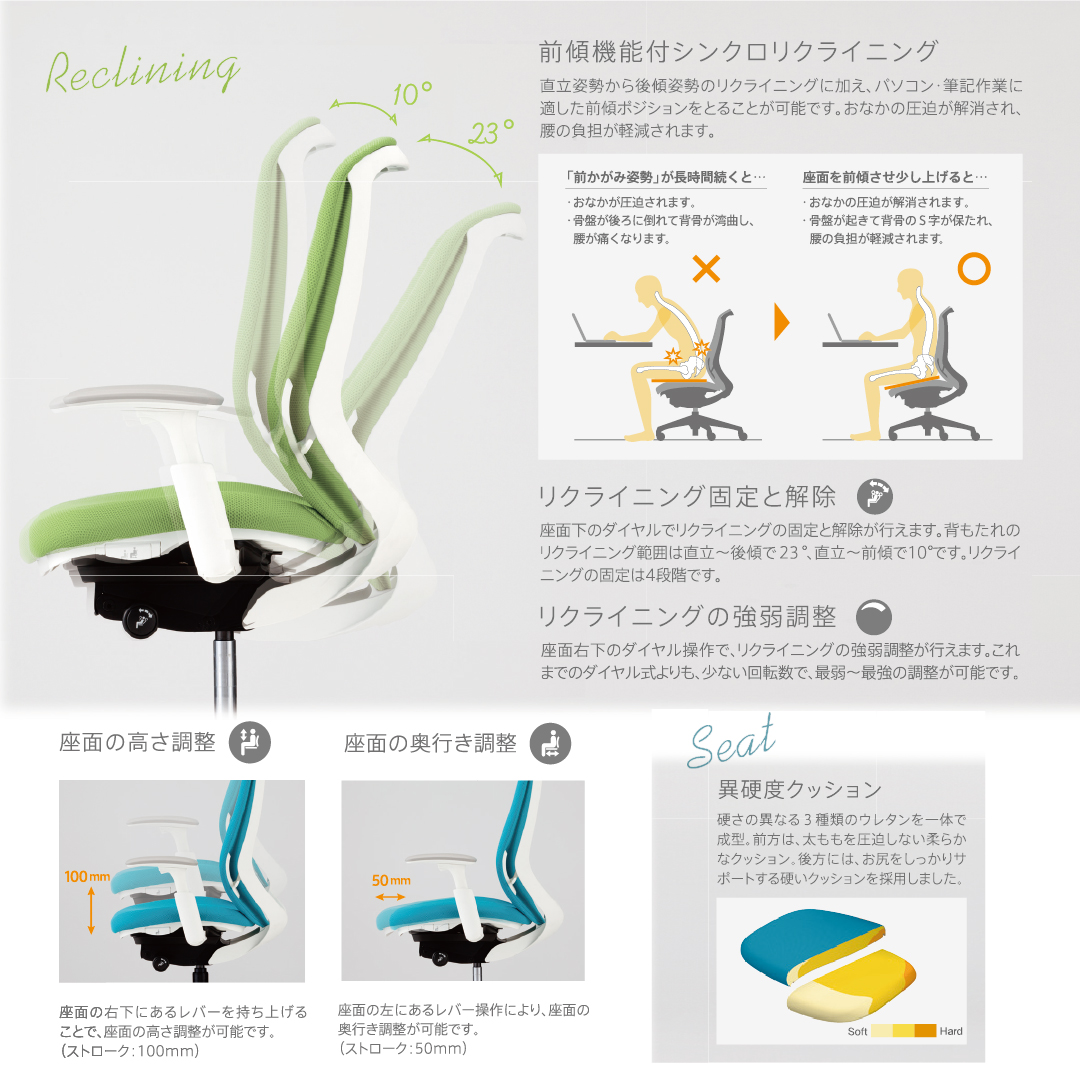 ・ガス圧上下機構 ・リクライニング時に任意固定可能 ・座面奥行調整 ・バックカーブアジャスト機構 ・ロッキング強弱調整 |