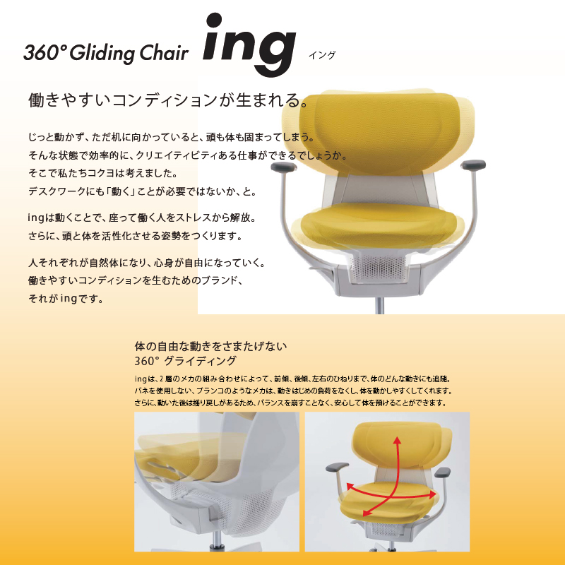 ・ガス圧上下機構 ・360°グライディング ・グライディングストッパー ・固定肘 |