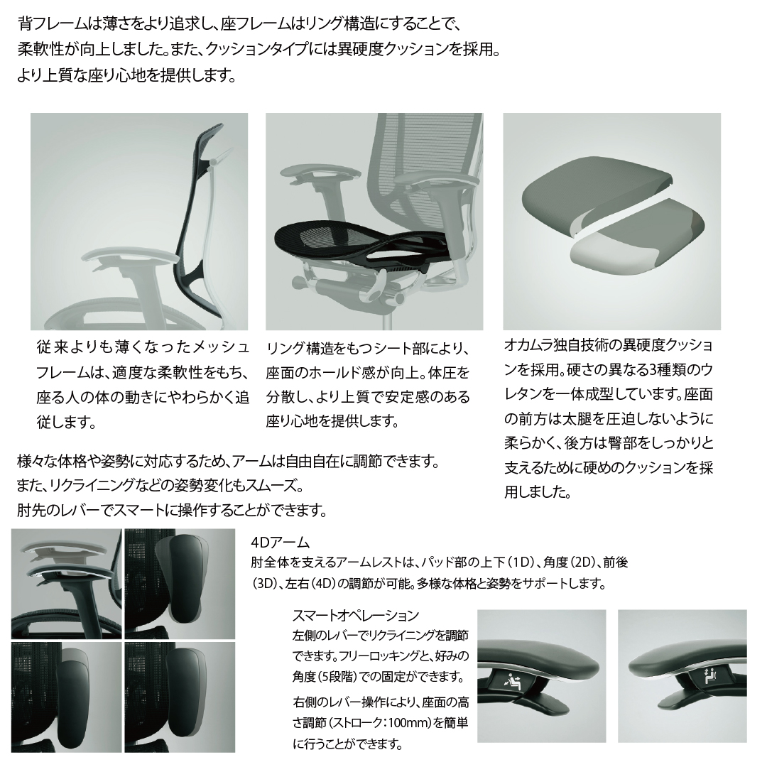 ・ガス圧上下機構。(右肘のレバーで操作) ・リクライニング時に任意固定可能。(左肘のレバーで操作) ・座面奥行調整。 ・アジャストアーム 4Dアーム(上下、角度、前後、左右調節可能) ・ロッキング強弱調整 ・ランバーサポート ・大型ヘッドレスト |